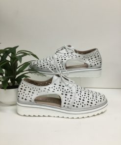 The CARENA by Just Bee, a stylish leather lace up shoe with cut out open sides. With its hole-punched styled upper and silver trimmed sole, these are the perfect shoe for adventures or those laid back days.
